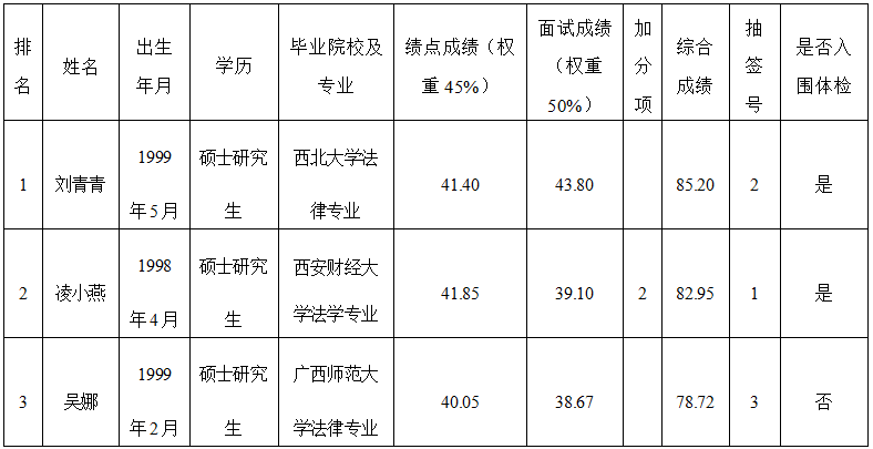 根據(jù)《安康市財信融資擔(dān)保有限公司高層次人才招聘公告》要求,經(jīng)資格審查及面試等程序,現(xiàn)將面試結(jié)果及入圍體檢人員公示如下: